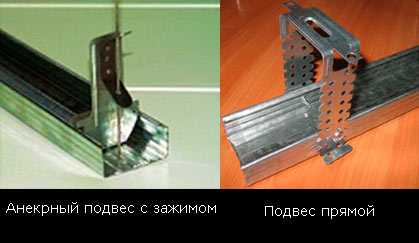 Крепление CD-профиля к потолку выполняется специальными подвесами, если его длина превышает 1,5 м. Их использование позволяет выполнить монтаж потолка на требуемой высоте, поднять выше или опустить. Для значительного опускания потолочной поверхности используют анкерные подвесы с зажимами.