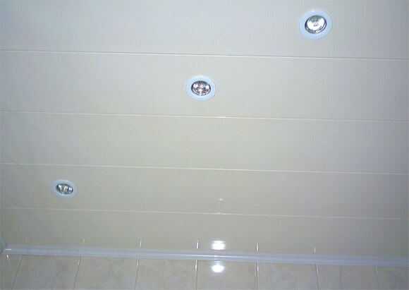 Потолок из пластиковых панелей имеет очень малый вес, а также обладает достаточной влагостойкостью, что позволяет его мыть.
