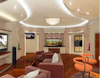 А вот в условиях частного дома, где залы и гостиные, как правило, отличаются особенно просторными габаритами, такой плоский потолок будет смотреться скучно. Здесь как раз можно дать волю фантазии и устроить сложные многоуровневые конструкции с подсветкой и встроенными светильниками. При наличии воздуховодов кондиционеров или другого оборудования и конструкций их можно безболезненно для высоты помещения спрятать с помощью устройства гипсокартонных коробов.
