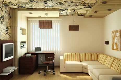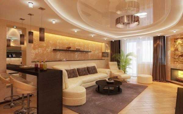Пример дизайна гостинойСовет. Комбинированный потолок предоставляет возможность воплотить самые неординарные идеи в реальность. Каждый последующий уровень можно сделать в другом цвете и форме.