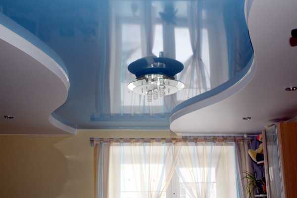 - Наилучший эффект натяжная потолочная конструкция даёт в помещениях с высоким потолком, особенно, если в ней несколько уровней. Визуальная корректировка требуется не только маленьким помещениям, но и большим. Объёмные фигуры на потолке могут сделать большую комнату более компактной и уютной. На примере сверху это хорошо видно.