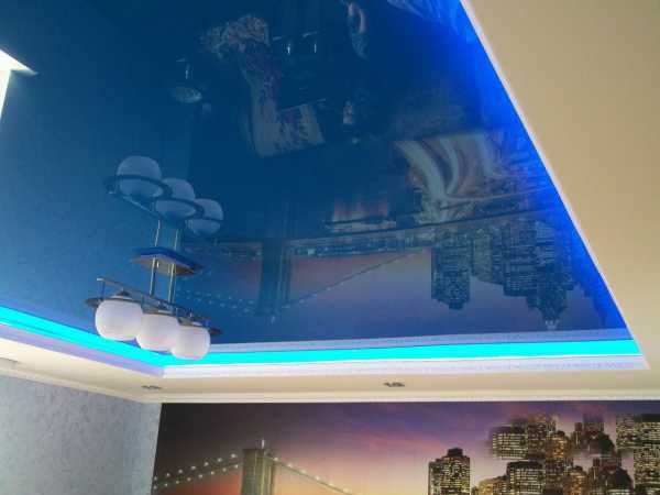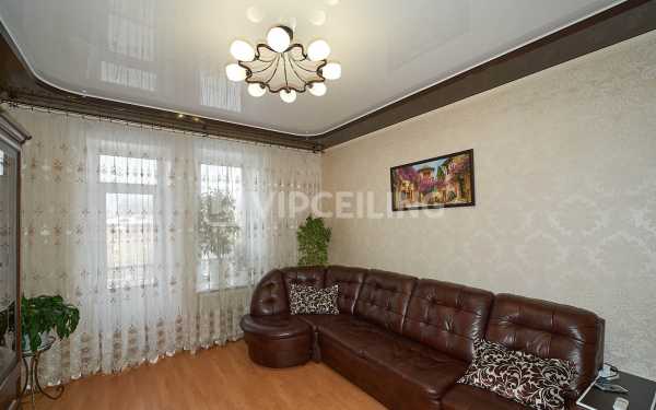 - Совсем другое дело, если тёмное полотно будет глянцевым, и натянуто не по всей площади потолка, а только по её центру. В этом случае, будет создаваться некое подобие колодца, ощущение глубины. Такой дизайн подойдёт и для зала, не отличающегося большой высотой.
