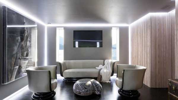 - Причём, граница перехода может быть и ломаной, и чётко очерченной. Углублений в таком потолке может быть несколько, создавая волнообразную поверхность. Конструкции такого типа нередко используют при оформлении гостиной в стиле модерн, или хай-тек.