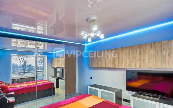 Натяжные потолки имеют сатиновую, глянцевую либо матовую поверхность. Натяжные глянцевые потолки могут очень сильно зрительно увеличить высоту помещения, потому лучше устанавливать их в помещениях с небольшой высотой. Глянец — наилучший вариант для низких комнат.