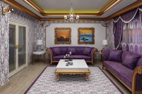 - Выбирая цвет, необходимо продумать, с какими элементами интерьера он будет гармонировать. Это могут быть не только обои или потолочные багеты, но и обивка мебели, шторы, покрытие пола.