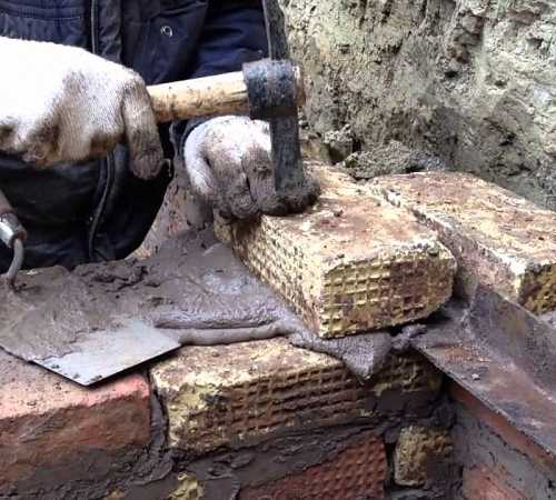 - Сверху укладывают 15-20 см жирной глины, в которую нужно поместить кирпичи на минимальном расстоянии друг от друга. Таким же способом укрепляются боковые стенки ямы.