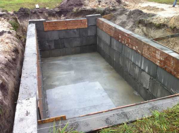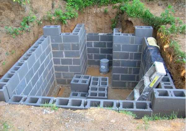 Чтобы построить полузаглубленный подвал своими руками, вырывают неглубокий котлован, потом делают невысокий фундамент, а стены строят из бетона, кирпича или камня.