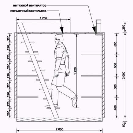 Рисунок 7. Чертеж земляного погребаСтеллажи внутри земляного погреба лучше располагать по две стороны от прохода для удобства эксплуатации помещения.