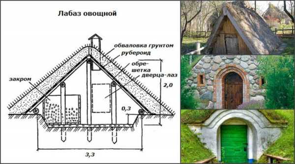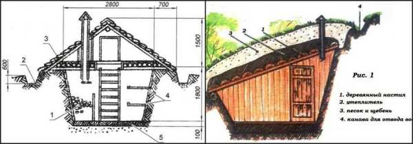 Рисунок 6. Чертеж и фото наземного погребаНаружную часть стен обшивают плотным материалом, чтобы предотвратить сквозняки внутри помещения. На входе обустраивают тамбур с наружной и внутренней дверью. Это обеспечит дополнительную теплоизоляцию. Для вентиляции делают трубу, которую прикрывают снаружи москитной сеткой. Для предотвращения затопления по периметру делают отмостку и несколько водоотводных канав, а крышу обустраивают двускатную, и накрывают ее любым доступным кровельным материалом.