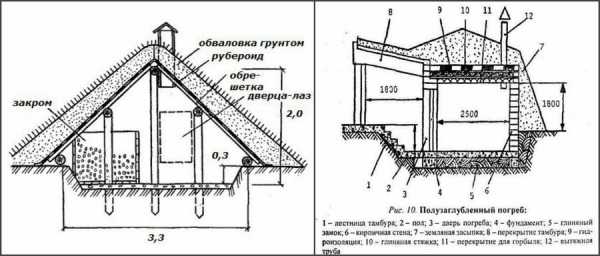 Рисунок 8. Чертежи для строительства полузаглубленного погребаПерекрытие делают из горбыля, смешанного с глиной. Это защитит внутреннее пространство от проникновения влаги и колебаний температуры. Дополнительно крышу можно покрыть рубероидом, а на стены нанести теплоизоляционный материал.