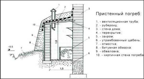 Рисунок 9. Чертеж пристенного погребаКак построить поверхностный погреб рядом с домом или другим зданием? Материалы можно использовать любые, но их нужно обработать горячим битумом для гидроизоляции. По периметру делают отмостку и устанавливают водосточные трубы для отвода влаги, а крышу покрывают рулонным материалом.