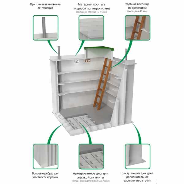 Погреб не требует абсолютно никакого ухода за пластиком. Пищевой полипропилен абсолютно безопасен для хранения Ваших домашних заготовок, овощей и фруктов, а срок службы погребов из полипропилена более 50 лет.