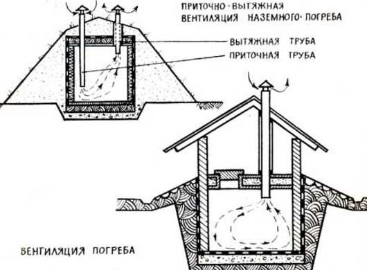 Такой элемент необходим для того, чтобы бороться с влагой и скоплением газов. Чаще всего используют трубу, которая соединяет внутреннюю часть и поверхность погреба. Но можно устанавливать две трубы, которые будут выполнять функцию вытяжки.