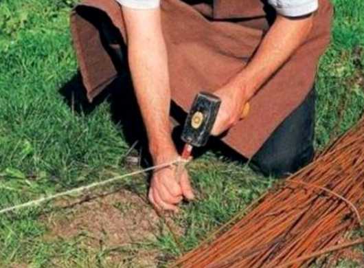 Теперь по всему периметру будущего сооружения вкопайте доски в землю (обработанной стороной вниз). Крепко свяжите их макушки между собой, так конструкция получится целостной.