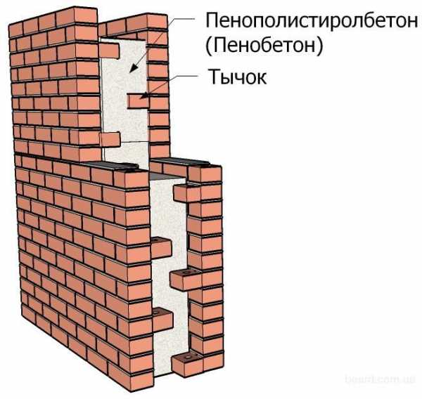 - Если уж возводить стенки полностью из кирпича, то делать это нужно по технологии колодцевой кладки. В принципе, это же самое: возводятся тонкие двойные стенки, а в них закладывается утеплитель. Таким способом строят даже дома – просто себестоимость работ в этом случае, будет несколько выше.