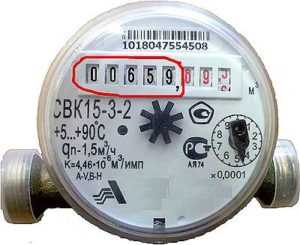 Счетчик воды как правило размещен в ванной или туалете. На его циферблате есть несколько черных и красных цифр. Для того чтобы узнать показатели, нужно посмотреть на прибор и округлить цифры до целого числа. Например, если у вас (659) на черном фоне, и (89+-) на красном, то округлив мы получаем 660 кубов.