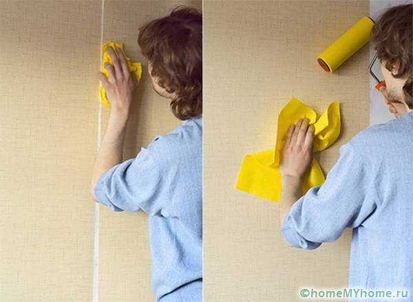 - Излишки клеевого состава убирают тряпкой. Если в углах обои плохо приклеились, можно еще раз нанести немного клея маленькой кистью.