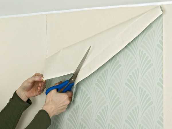 Лишний материал следует подрезать. Следите, чтобы нижний край обоев немного заходил за плинтус.