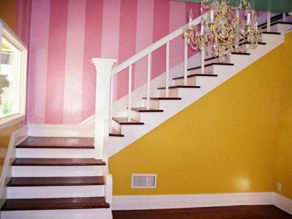 Для визуального увеличения пространства дизайнеры выбирают покраску поверхностей в горизонтальные или вертикальные полосы двух цветов. Первые позволяют раздвинуть стены, вторые – приподнять потолок. В зависимости от их ширины создаётся определённое ощущение свободы и воздушности. Полосатый интерьер несложно создать своими руками. Для этого надо просто аккуратно приклеить малярную ленту, которая сыграет роль ориентира для нанесения одного из двух цветов.