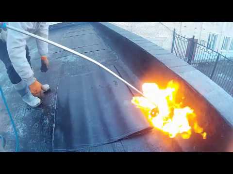 - Начинают укладку с нижнего края крыши так, чтобы полоса для нахлеста рулонов была обращена в сторону крыши. Первым слоем укладывают подкладочныйстеклоизол марки ХПП или ТПП. Рулон слегка раскатывают, равномерно нагревают раскатанную часть с помощью паяльной лампы до белого цвета полимерной пленки и прижимают к крыше, прокатывая стеклоизол ручным катком.
