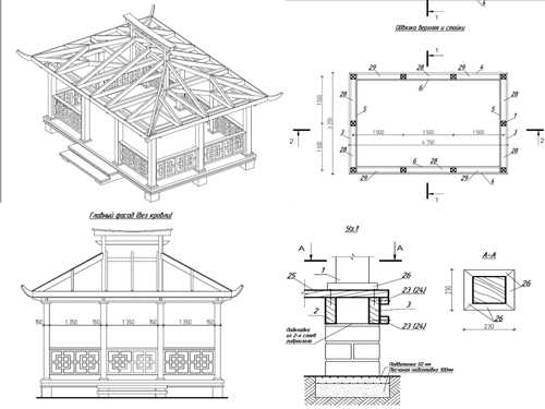 При строительстве беседки своими руками чертежи и размеры надо подготовить качественно. Постройка должна выдерживать сильный ветер, снеговую нагрузку зимой, она должна быть прочной.