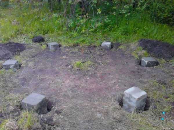 Необходимо вырыть яму глубиной 20-30 см, сделать на дне песчаное основание, установить шлакоблок, засыпать его гравием и грунтом, выставить по уровню и тщательно утрамбовать. Количество столбов основания зависит от размеров беседки. В углах и самом центре они обязательны, далее через каждые метр/полтора.