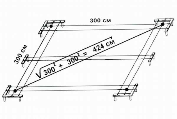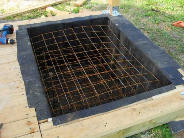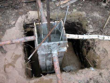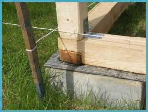 Количество опорных стоек определяется выбранным проектом. Для каждой стойки роют кубическую яму со стороной 25 см. Каждая яма окружается опалубкой высотой 15 см. Опоры заливают бетоном и выравнивают при помощи длинной доски и строительного уровня. Бетон застывает в течение 3-4 дней.