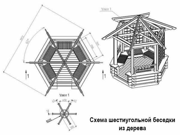 Схема каркаса шестиугольной беседкиРазумеется, для самостоятельного строительства лучше всего подойдет древесина. Это доступный и недорогой материал, не требующий особых навыков работы.