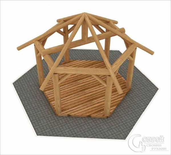 Таким образом получаются стропильная система, остается только покрыть её доской либо фанерой, а затем рубероидом и битумной черепицей. При необходимости обвязку крыши можно укрепить дополнительными стропилами. Для этого лучше всего отдельно посмотреть фото беседки со стропильной крышей шатрового типа и выбрать подходящий вариант.