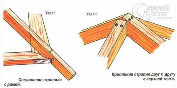 Для изготовления двускатной крыши необходимо возвести 4 стропила от каждой стороны постройки, которые в наивысшей точке соединит балка. Между собой и к брусу обвязки они дополнительно крепятся рейками.