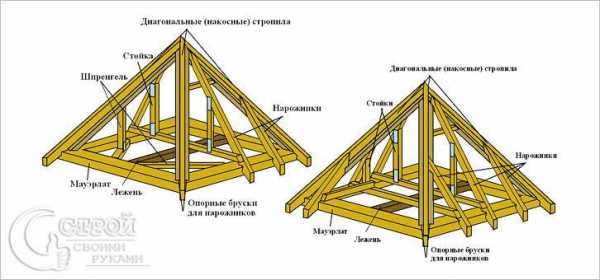 В случае четырехскатной крыши стропила устанавливаются по четырем углам, дополнительные балки крепятся на середине каждой стороны.