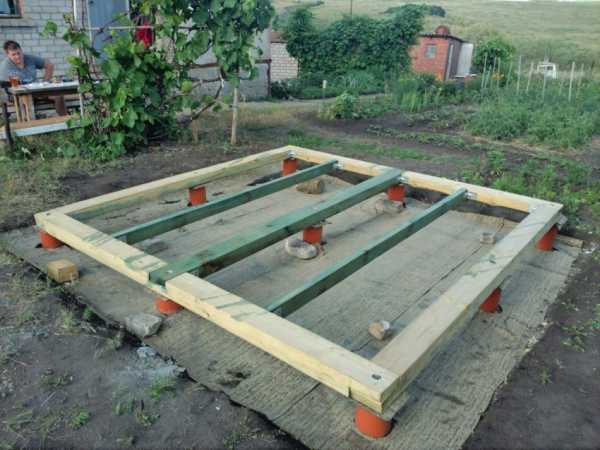 Когда бетон застынет, на опоры надо установить швеллеры и соединить их сваркой по периметру. К швеллерам приваривается обрешетка из профильной трубы, сверху пол зашивается доской.