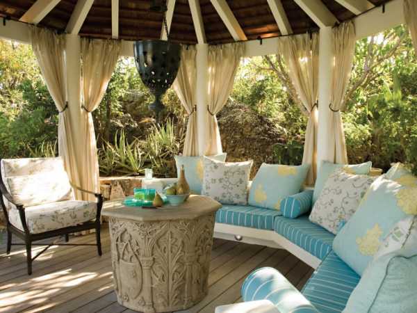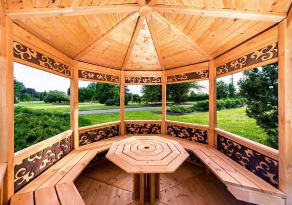 После того как беседка приобрела свой окончательный вид, переходят к внутренней отделке и заполнению ее предметами мебели.