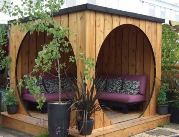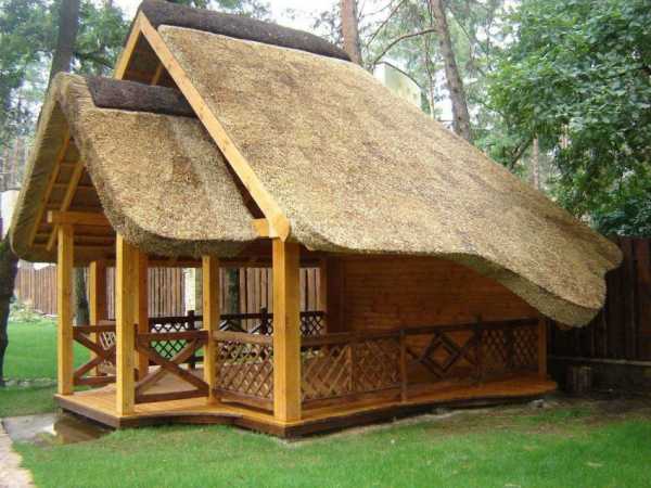 Толстые стволы подойдут для изготовления опорных столбов, ветки разной величины пригодятся, чтобы зашить проемы. Форма павильона будет зависеть от особенностей используемых деревянных элементов. Крышу стоит покрыть камышом или дранкой. Под действием солнца и дождей она приобретет серебряный цвет и будет сиять, как драгоценный металл.