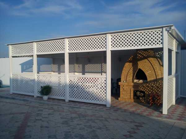 Красивые воздушные беседки получаются при изготовлении боковых панелей из тонких реек. Панель может полностью перекрывать пространство между вертикальными столбами, решетка из реек не помешает воздуху и солнцу проникать в помещение.