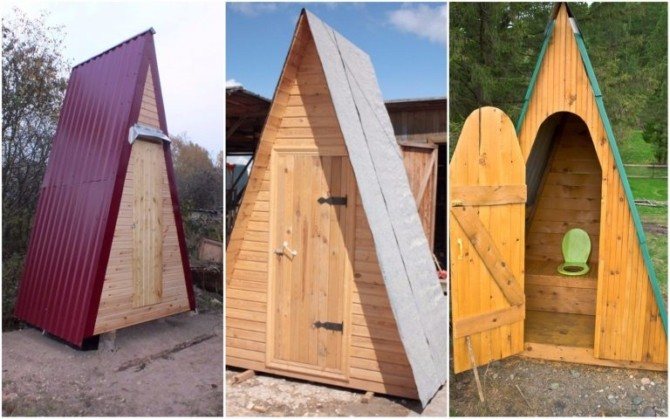 Туалет в форме треугольной пирамиды, напоминающий шалаш, изготовить проще, чем «теремок».
