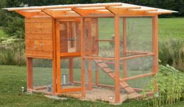 Вход в курятник и выгул строят с южной стороны, которая защищена от ветров. Вольер прячут под крышу или накрывают навесом: от жаркого солнца и дождя.