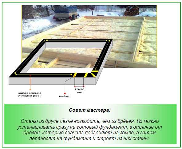 Приступайте к укладке первого венца стен. Для этого сначала уложите на гидроизолированное основание предварительно обработанные антисептиком рейки толщиной до 1,5 см. Рейки укладывайте с шагом порядка 30 см.