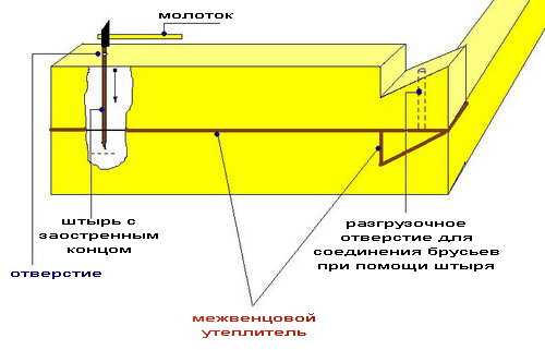 Для крепления по вертикали на верхних бревнах снизу делается паз, которым они ложатся на нижние, а потом соединяются штырями.