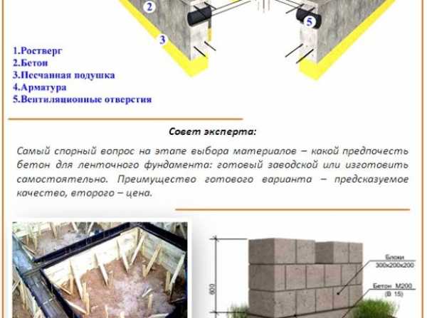 Самым простым в исполнении и распространенным является ленточный фундамент. Для него сначала выкапывается траншея, в нее насыпается слой песка толщиной до 20 см, заливается водой и трамбуется. Затем следует слой щебня и арматура. Все это заливается бетоном до уровня земли или пола, смотря какой цоколь, кирпичный или бетонный, будет у постройки. Если цоколь будет кирпичным, следует между кирпичной кладкой и бетоном проложить слой гидроизоляции. Также в кладке на 2-3 ряду нужно выполнить вентиляционные продухи.