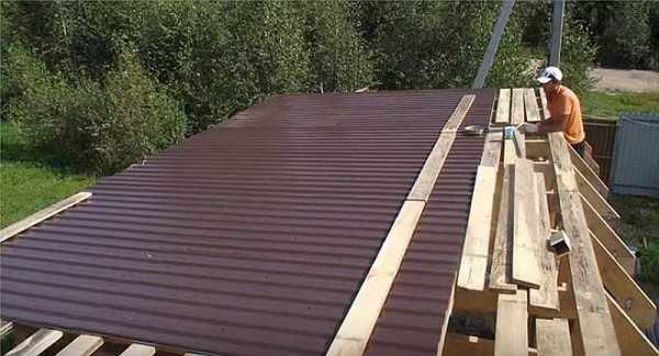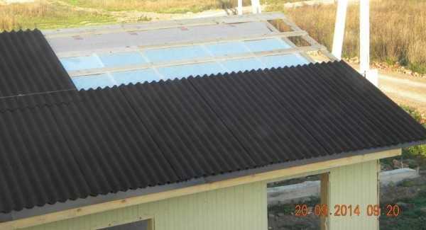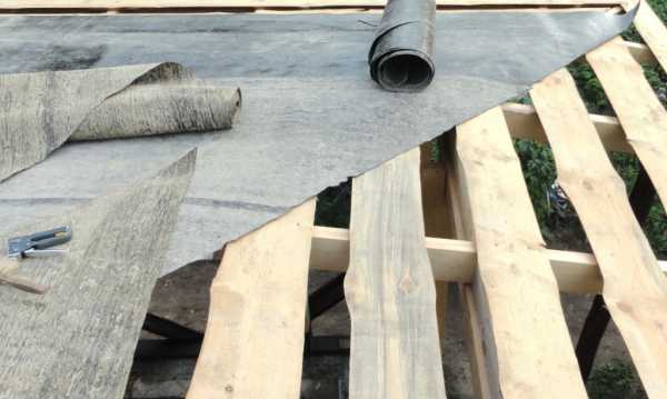 Шаг пятый. В завершении кровлю нужно гидроизолировать. Для защиты от влаги можете использовать уже знакомый вам рубероид. Данный гидроизоляционный материал укладывается по методу наплавления. Также рубероид можно крепить с использованием битумной мастики. Листы рубероида укладывайте с нахлестом порядка 100-150 мм. По краям крыши делайте нахлест на козырек.