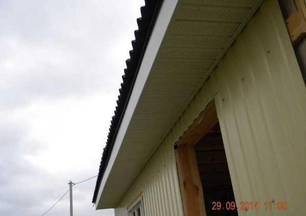 Листы профнастила тоже крепятся на саморезы со специальной резиновой прокладкой. Нарезать материал можно электролобзиком. Для этого этапа работ желательно заручиться помощью двух-трёх человек. Командой выполнять обшивку профнастилом гораздо легче.