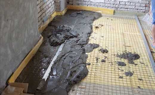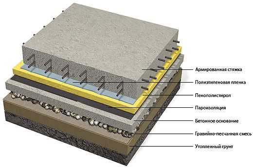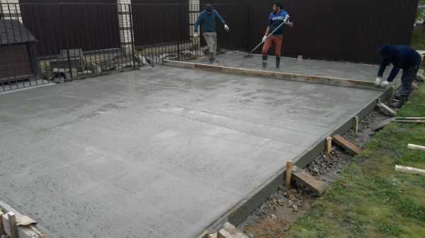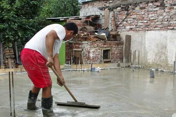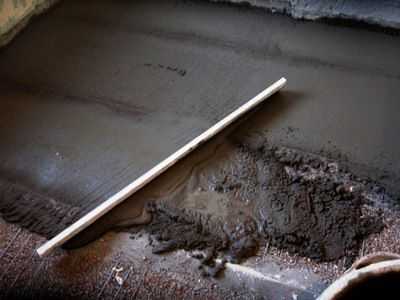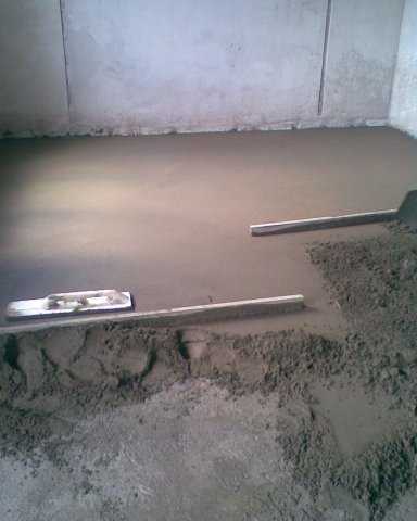 При устройстве пола рекомендуется выполнять стяжку, толщиной не менее 10 см. Оптимальный материал для решения этой задачи – бетон М200. Заливать его надо в несколько слоёв, затем просушить и затереть.