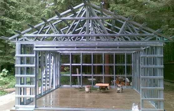 После того как фундамент наберёт прочность, можно монтировать металлический каркас. Сначала нужно подготовить трубы по размерам, соответствующим проекту. Разрезать их можно болгаркой, электролобзиком, соединять – сваркой. Если вы ранее уже имели опыт работы со сваркой, то для монтажа каркаса вам понадобится менее трёх дней. Если вы только осваиваете это оборудование, то сможете собрать каркас за неделю. Обязательно сверяйте размеры материала с проектом, чтобы избежать досадных ошибок.