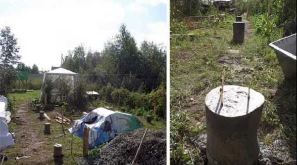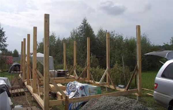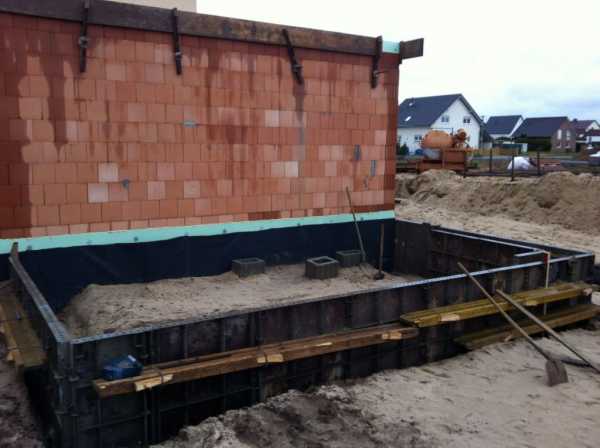 После этого работа осуществляется по стандартной схеме. По периметру котлована устанавливается опалубка, к ней крепятся усиливающие прутья, соединённые между собой проволокой. После этого в подготовленные скважины устанавливаются стойки каркаса.