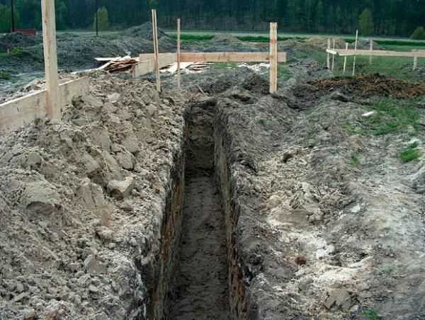 Роем траншею в соответствии с разметкой. В идеале глубина конструкции должна превышать уровень промерзания почвы. Чаще всего заглубляются на 60-80, а иногда и на 100 см. На этом же этапе подготавливаем углубления для погреба и смотровой ямы, если их наличие предусмотрено проектом.