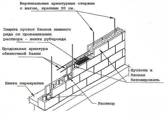 В верхней части стен оставляем гнезда для установки балок перекрытия. Рекомендованные размеры – 200х200х150 мм. Зазоры потом сможете заложить или задуть. Оптимальный шаг размещения гнезд – 100 см.