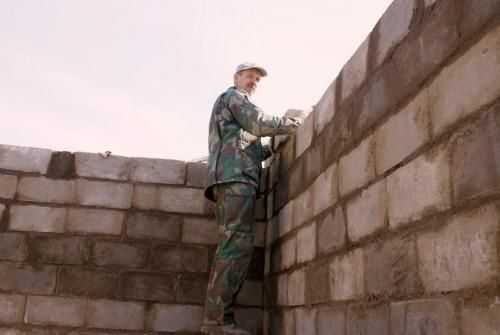 Итак, фундамент затвердел, между ним и первым рядом кирпичей надо уложить рубероид для гидроизоляции стыков. В противном случае грунтовые воды будут проникать в стены, разрушая их. Кладку блоков производят на специальный строительный клей, резать их можно болгаркой или ручной пилой.