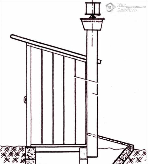 Для устройства вентиляции можно приспособить обычную канализационную трубу из ПВХ диаметром 10 см. Труба закрепляется с помощью жестяных хомутов к задней стенке туалета и проводится через специальное отверстие в подиуме (или в полу) в выгребную яму на 7 – 10 см. Верхняя часть трубы выводится наружу туалетного домика через крышу минимум на 20 см. Место прохода трубы в яму изолируется паклей, смоченной в битумной грунтовке, а выход в крышу закрывается жестяным фартуком и цементируется или заливается битумом. Для усиления тяги желательно на оголовок трубы установить насадку – дефлектор.