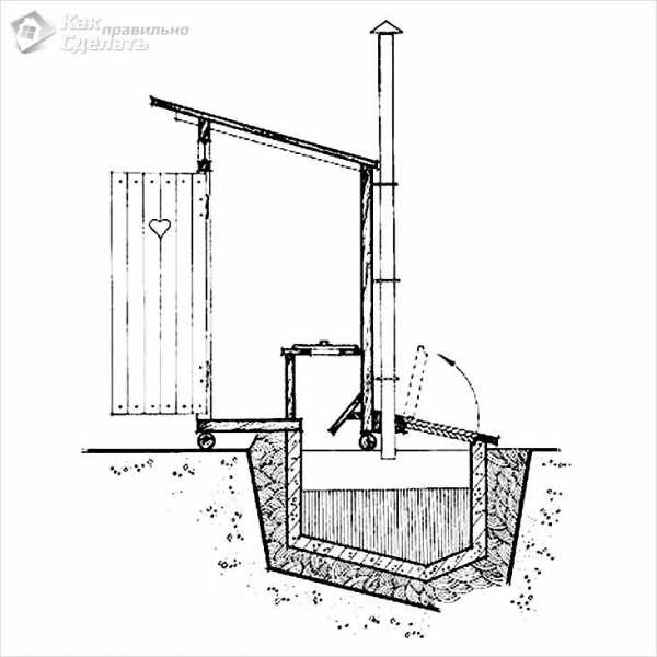 При постройке туалета на даче выгребная яма может выходить за его пределы с задней стороны и оснащаться крышкой для удобства очисткиВентиляция туалета